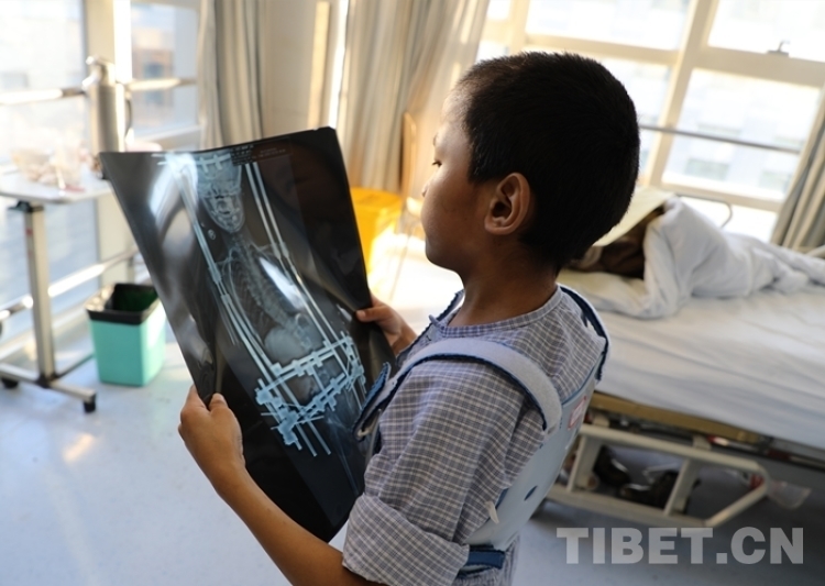 病房內,9歲的扎西曲培已經完成了手術,在病房里奔走玩耍。他煞有介事地拿起自己的x光片,說“這是我的,快治好的。”李淳德說,“這個小男孩調皮得很,天天很活躍,眼睛里都是機靈。剛來的時候他肩膀一個高一個低,肩胛骨也不對稱,如今走路的時候形態完全正常,身高長了12公分,因為年齡小,將來恢復估計會更好一些。”