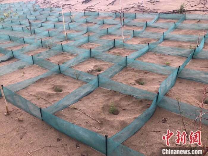 “傳統的方法是用廢樹枝等擺成方格等一定的形狀壓沙,里面再種上植物,效果很好但樹枝往往四五年就腐爛了;最近我們在嘗試推廣一種新型化學材料方格,成規模快,且能維持七到十年。”中國科學院西北生態資源研究院研究員常學向對記者說。