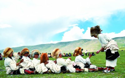 近期,藏北草原氣候溫暖,西藏班戈縣青龍鄉牧民在草原上做游戲。新華社發