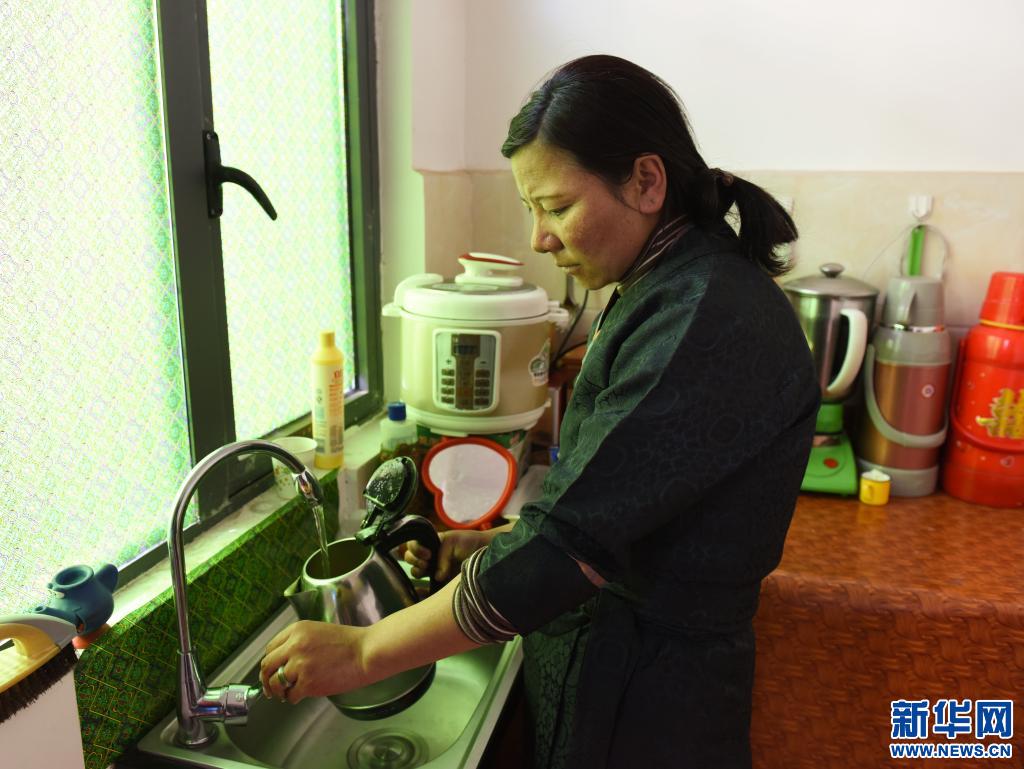 森布日極高海拔生態搬遷安置點內,村民次仁卓嘎終于在家里用上了自來水(2020年1月12日攝)。新華社記者 田金文 攝