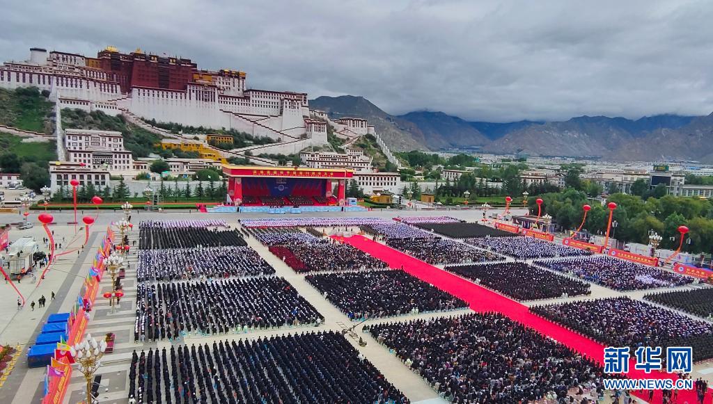 這是8月19日拍攝的慶祝西藏和平解放70周年大會現場。當日,西藏各族各界干部群眾2萬多人歡聚在拉薩布達拉宮廣場,熱烈慶祝西藏和平解放70周年。新華社記者 孫瑞博 攝