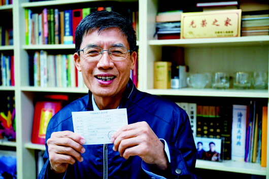 4月22日,李純民在天津家中展示2002年向青藏鐵路建設捐款的匯款單存根。記者劉金海、黃臻攝