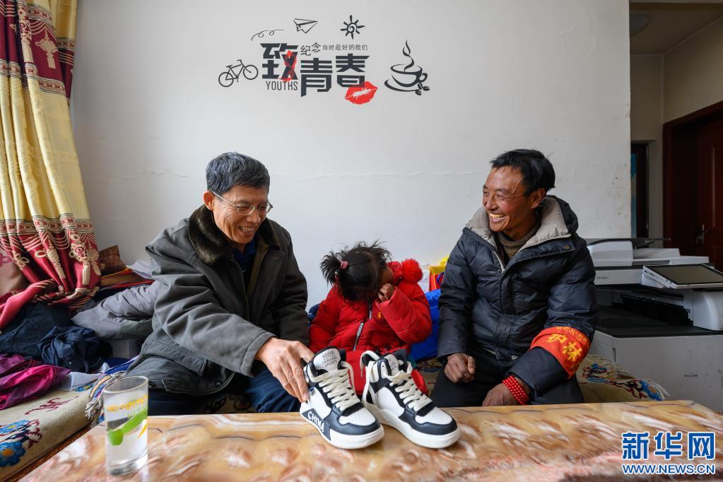 5月3日,在西藏昌都市類烏齊縣伊日鄉(xiāng)小學,扎西措姆(中)在父親帕巴澤仁(右)的陪伴下,接受李純民(左)贈予的一雙為她專門定制的新鞋。扎西措姆自幼患有足部殘疾,穿普通鞋子無法舒適行走。2020年,李純民個人出資為扎西措姆定制了一雙鞋。不久前,得知扎西措姆的鞋子穿破后,李純民再次為她定制了一雙新鞋。新華社記者 劉金海 攝
