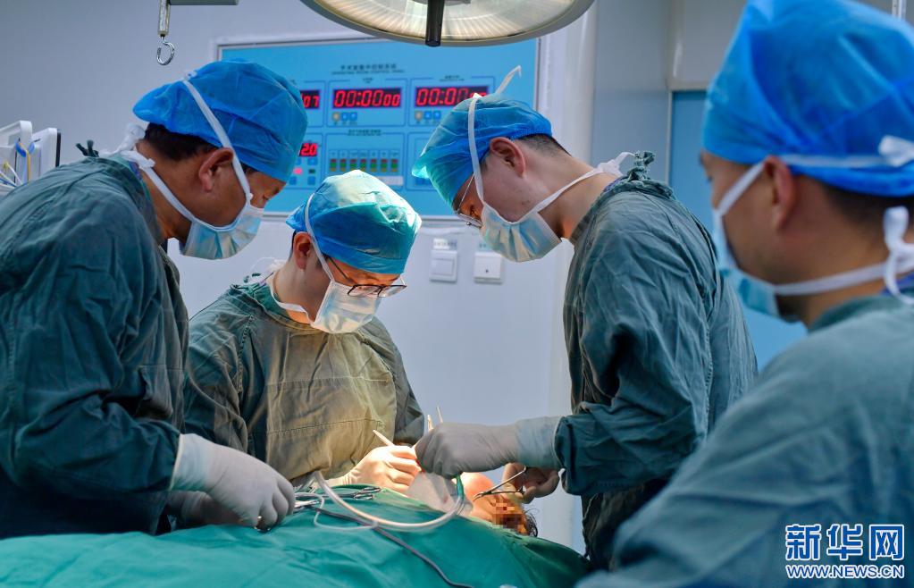 在西藏自治區人民醫院手術室,王克明(左二)和同事為面部畸形患者做手術(5月11日攝)。新華社記者 張汝鋒 攝