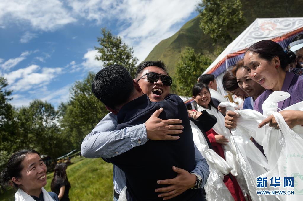 在西藏拉薩市達(dá)孜區(qū),北京大學(xué)腫瘤醫(yī)院的援藏醫(yī)生袁燦(戴墨鏡者)與送別的藏族同事?lián)肀В?020年8月1日攝)。新華社記者 彭子洋 攝