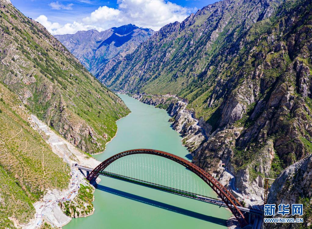 6月25日,全長(zhǎng)435公里、設(shè)計(jì)時(shí)速160公里的拉林鐵路建成通車,西藏首條電氣化鐵路建成,同時(shí)復(fù)興號(hào)實(shí)現(xiàn)對(duì)31個(gè)省區(qū)市全覆蓋。這是試運(yùn)行的復(fù)興號(hào)列車行駛在藏木特大橋(無人機(jī)照片,6月17日攝)。新華社記者 普布扎西 攝