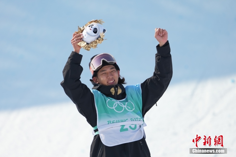 2月15日,北京2022年冬奧會單板滑雪男子大跳臺決賽在首鋼滑雪大跳臺舉行,中國選手蘇翊鳴獲得冠軍。圖為蘇翊鳴在頒發紀念品儀式上。 中新社記者 毛建軍 攝