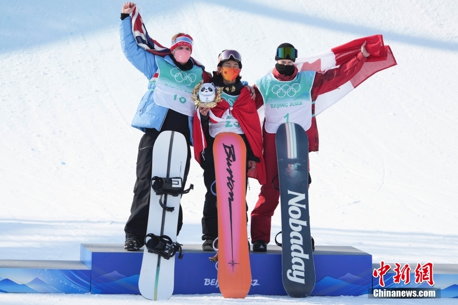 2月15日,北京2022年冬奧會單板滑雪男子大跳臺決賽在首鋼滑雪大跳臺舉行,中國選手蘇翊鳴(中)獲得冠軍,挪威選手蒙斯·勒伊斯韋蘭 (左)獲得亞軍,加拿大選手馬克斯·帕羅特(右)獲得季軍。圖為頒發紀念品儀式。 中新社記者 毛建軍 攝