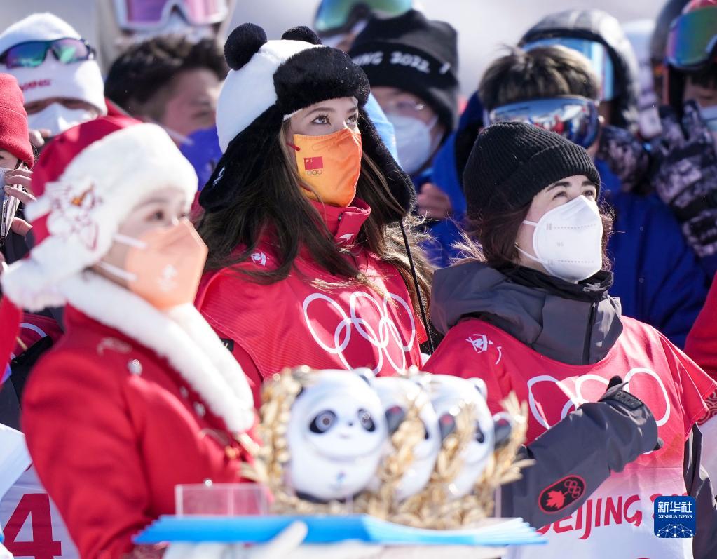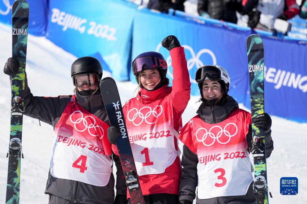 2月18日,獲得冠軍的中國(guó)隊(duì)選手谷愛(ài)凌(中)、獲得亞軍的加拿大選手凱茜·夏普(左)和獲得季軍的加拿大選手蕾切爾·卡克在比賽后慶祝。新華社記者 王昊飛 攝