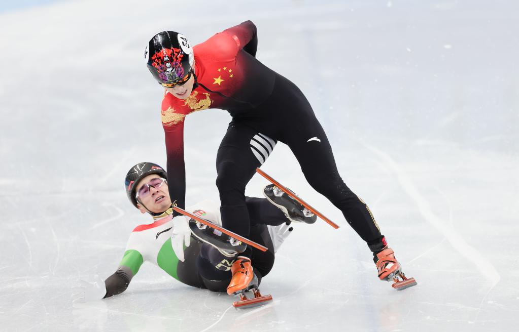 2月7日,中國隊選手任子威(上)與匈牙利隊選手劉少林在短道速滑男子1000米決賽中沖線后。新華社記者蘭紅光攝