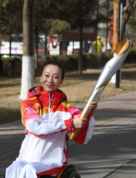 3月4日,火炬手劉巖在北京冬殘奧會火炬傳遞活動中。新華社記者李欣攝
