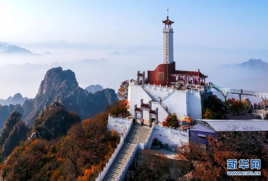 這是狼牙山棋盤(pán)陀峰頂?shù)摹袄茄郎轿逵率考o(jì)念塔”(2017年10月27日攝,無(wú)人機(jī)照片)。新華社發(fā)
