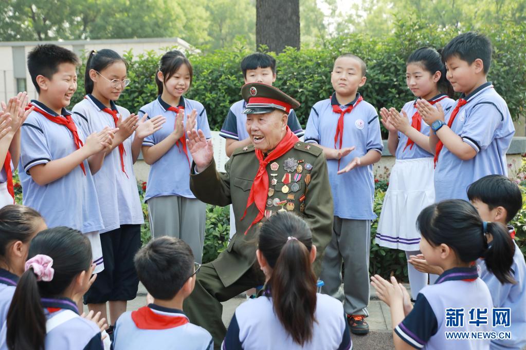 王占山(中)給河南省安陽市三官廟小學的少先隊員們講戰斗故事(6月11日攝)。新華社發(戴丹華 攝)