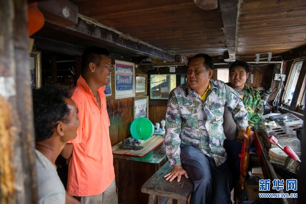 在海南省瓊海市潭門港的漁船上,王書茂(右二)與漁民交流(2018年11月14日攝)。新華社發(宋國強 攝)