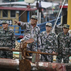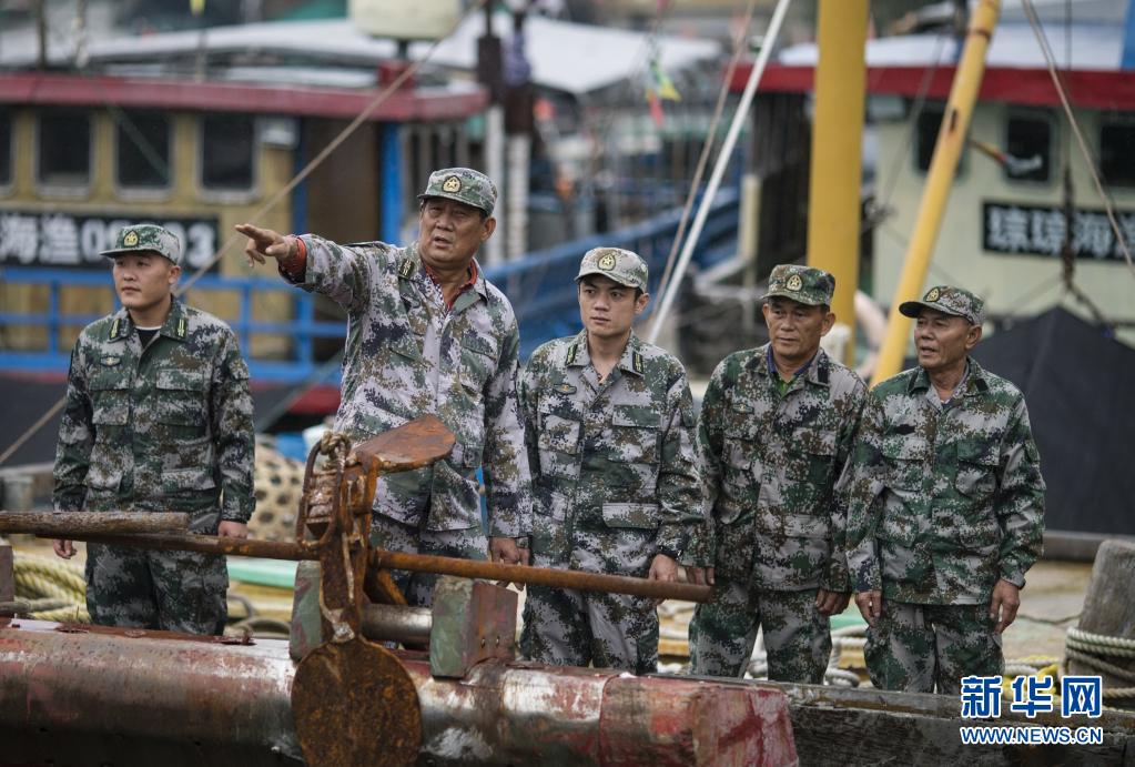 在海南省瓊海市潭門鎮,潭門海上民兵連副連長王書茂(左二)在組織民兵開展訓練任務(2018年12月10日攝)。新華社發(宋國強 攝)