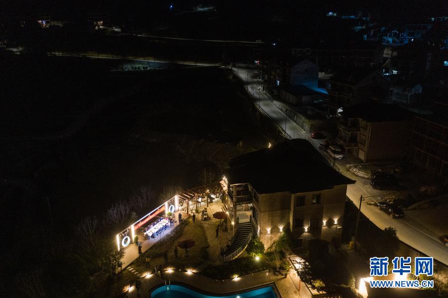 2月22日,桐廬縣鐘山鄉鄉賢代表、民宿業主代表、桐廬縣鄉兩級人大代表以及黨員和村民代表在鐘山鄉參加“新村夜話”討論活動(無人機照片)。新華社記者 徐昱 攝