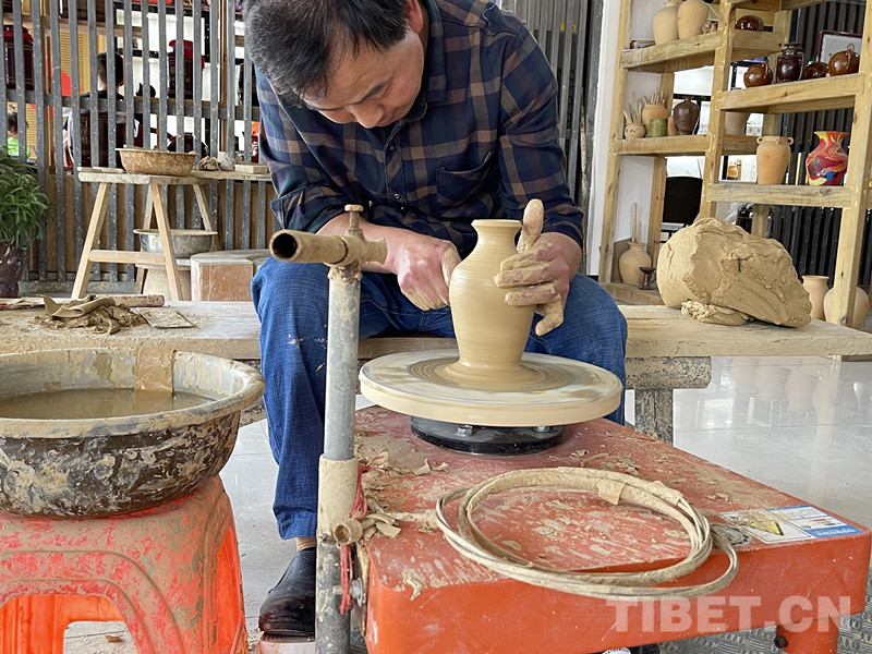花茂村的土陶制作有著140多年的歷史,53歲的母先才是家族制陶的第四代傳人,也是土陶非遺文化傳承人。在母先才的陶藝體驗館里,擺放著各種成品,供游客觀摩、選購,還有數十臺拉坯機,供游客或學徒們使用。
