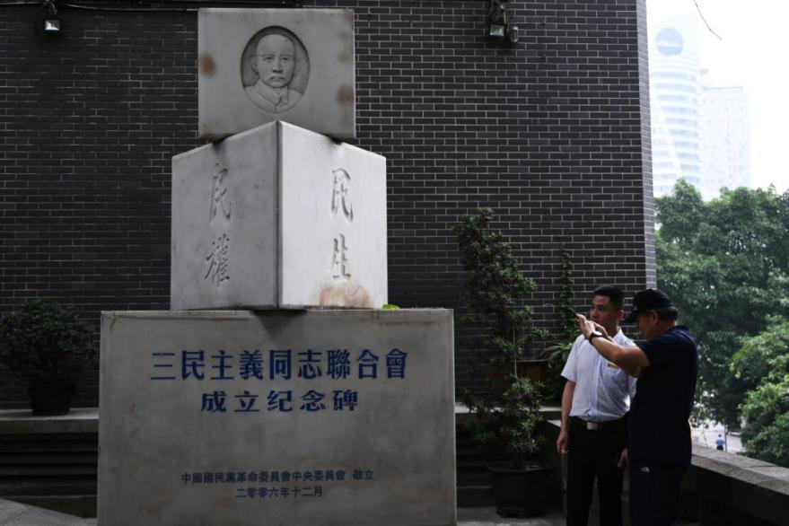 6月21日,媒體記者在位于重慶的中國民主黨派歷史陳列館參觀“三民主義同志聯合會成立紀念碑”。