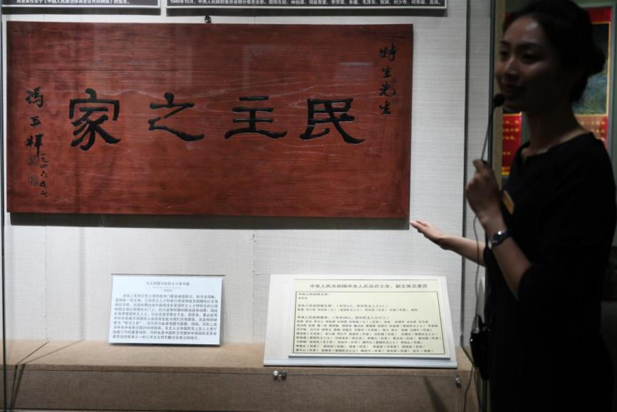6月21日,在位于重慶的中國民主黨派歷史陳列館內,工作人員向媒體記者介紹展陳的“民主之家牌匾”。