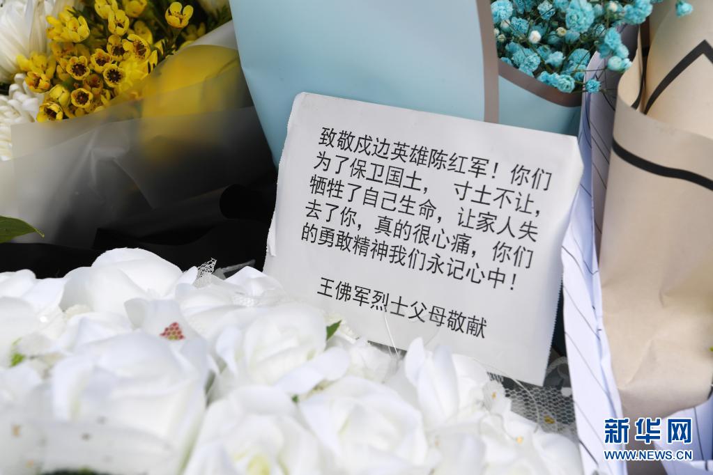 這是在甘肅省蘭州市烈士陵園拍攝的王佛軍烈士父母給陳紅軍烈士敬獻的花束留言(2月23日攝)。新華社記者 范培珅 攝