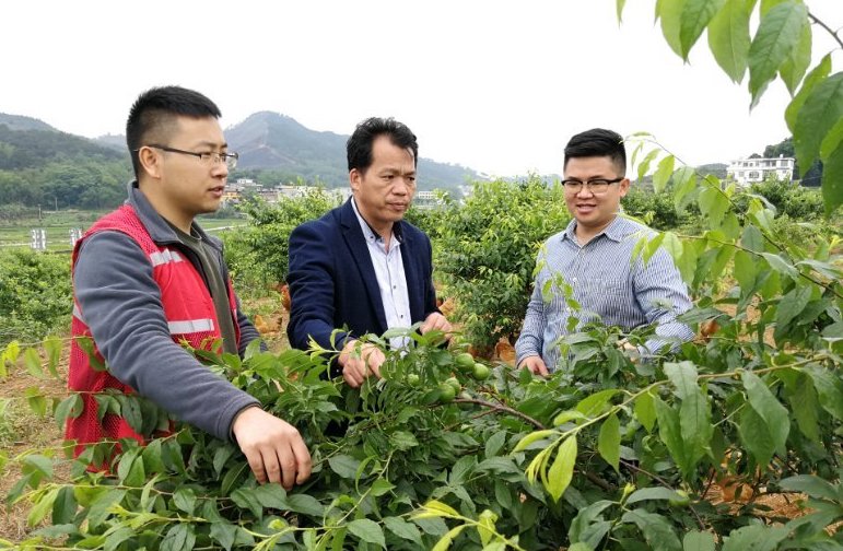 廣西馬山縣林圩鎮伏興村駐村第一書記周福波(左一)在查看村里已經掛果的三華李。