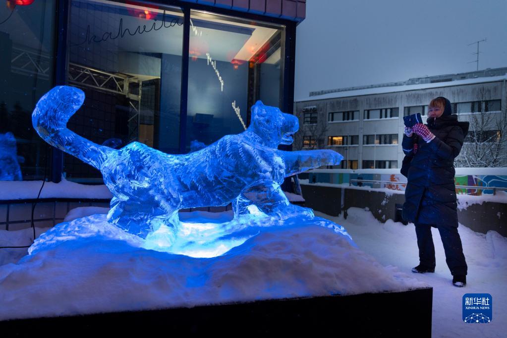 1月31日,芬蘭赫爾辛基市民為冰雕“老虎”拍照。新華社發(fā)(馬蒂·馬蒂凱寧攝)