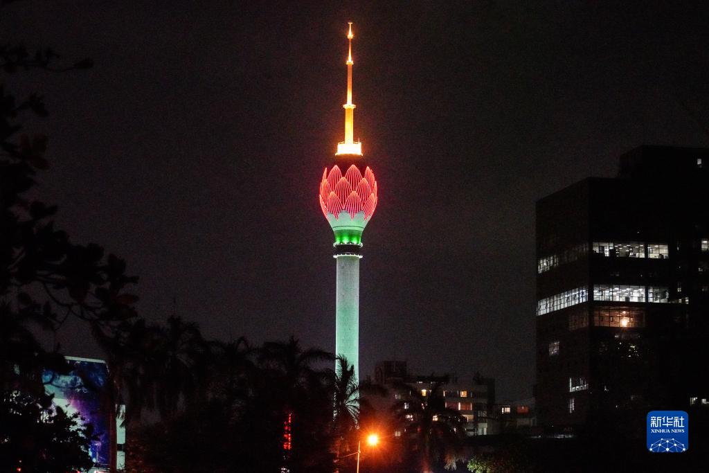 這是1月31日在斯里蘭卡科倫坡拍攝的點(diǎn)亮“中國紅”的蓮花電視塔。新華社記者 唐璐 攝