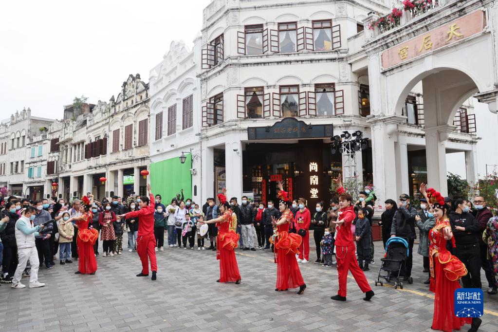 2月5日,市民在海口市騎樓老街觀看表演。新華社記者 張麗蕓 攝