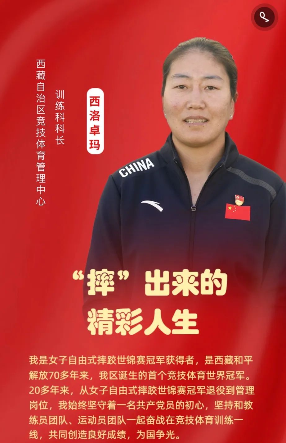 她是摔跤名將,是西藏和平解放70多年來,西藏誕生的首個競技體育世界冠軍。20多年來,從女子自由式摔跤世錦賽冠軍退役到管理崗位,她始終堅守著一名共產黨員的初心,堅持和教練員團隊、運動員團隊一起奮戰在競技體育訓練一線,共同創造良好成績,為國爭光。