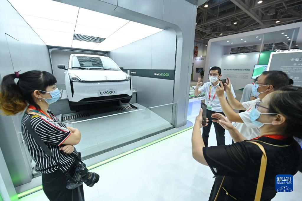 在福建廈門舉行的第二十二屆中國國際投資貿易洽談會的寧德時代展位,來訪者參觀新能源汽車換電過程(2022年9月8日攝)。新華社記者 林善傳 攝