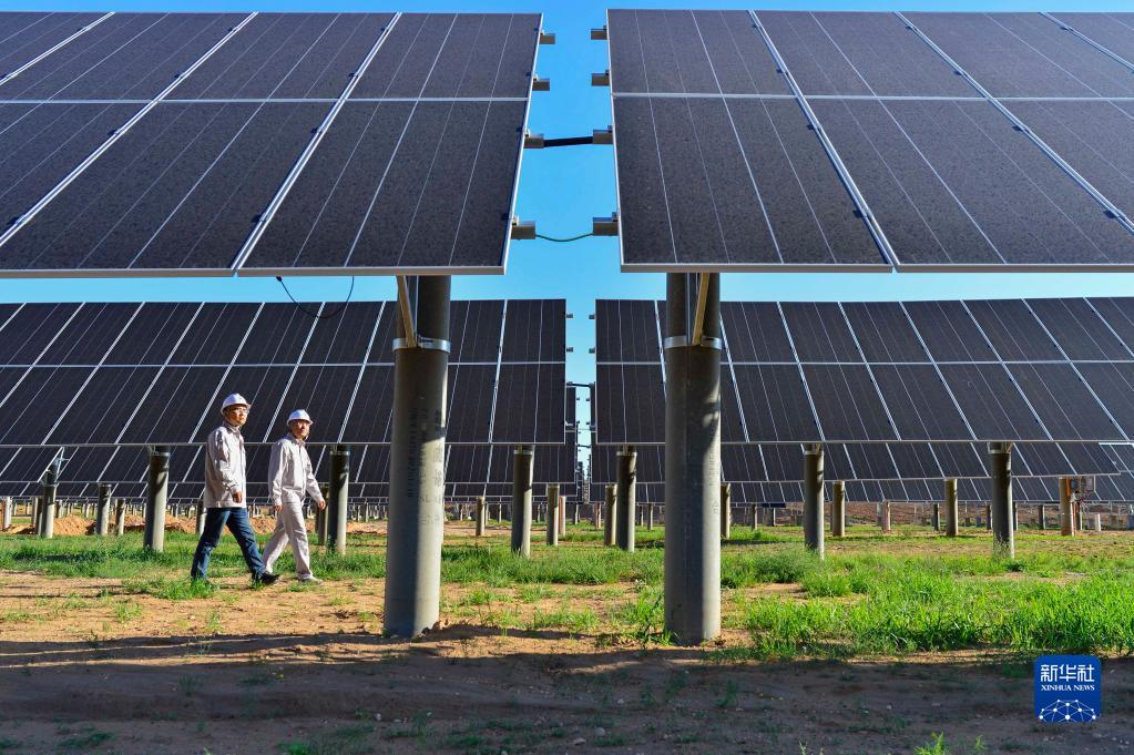 工作人員在內蒙古自治區鄂爾多斯市伊金霍洛旗天驕綠能50萬千瓦采煤沉陷區生態治理光伏發電示范項目區里巡查(2021年7月8日攝)。 新華社發(王正 攝)