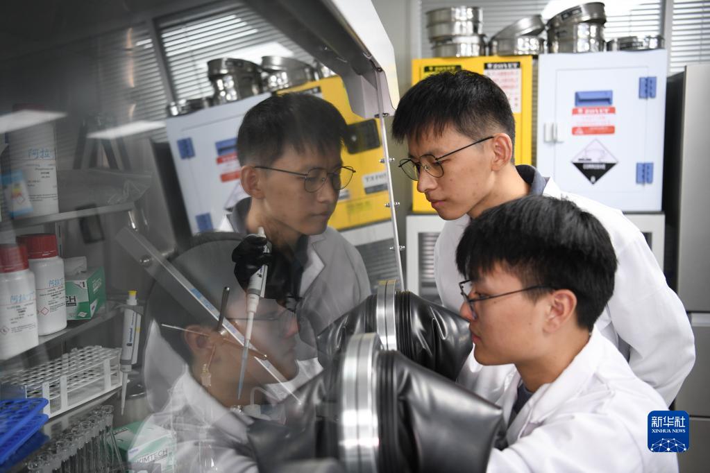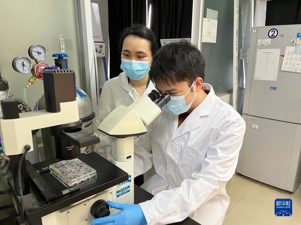 10月20日,廣東中山大學中山醫學院博士研究生張賢濤(右)在實驗室。新華社發