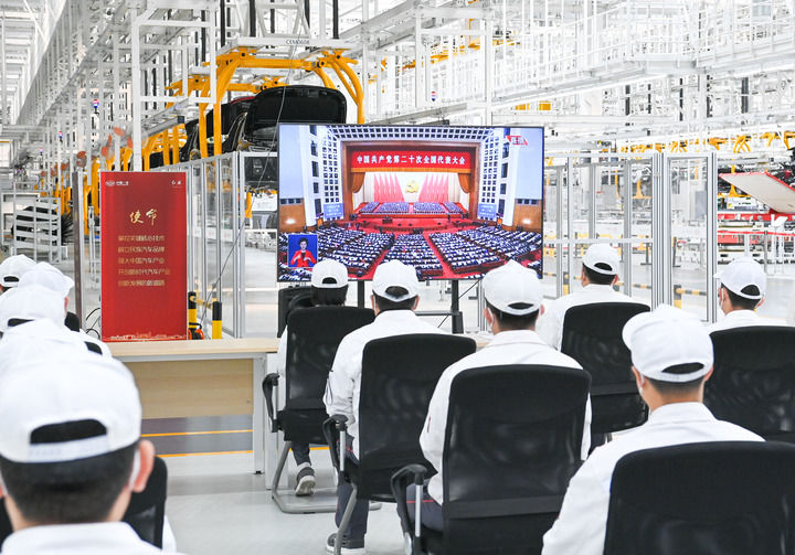 10月16日,在吉林省長春市中國第一汽車集團有限公司紅旗繁榮工廠,職工在收看中國共產黨第二十次全國代表大會開幕會。新華社記者 顏麟蘊 攝