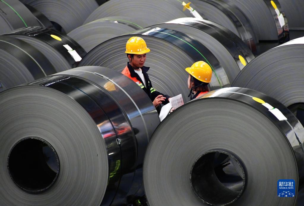 兩名質檢員在福安青拓冷軋科技有限公司生產車間檢查不銹鋼卷成品(2022年8月17日攝)。新華社記者 魏培全 攝