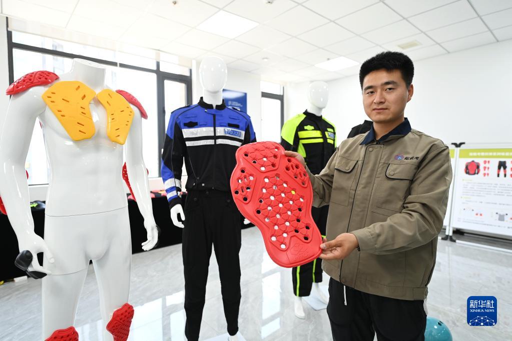 在位于秦創原總窗口所在地陜西省西咸新區的陜西拓銳考新材料科技有限公司,工作人員展示自主研發的納米智能吸能慢回彈護具(2022年6月17日攝)。新華社記者 李一博 攝
