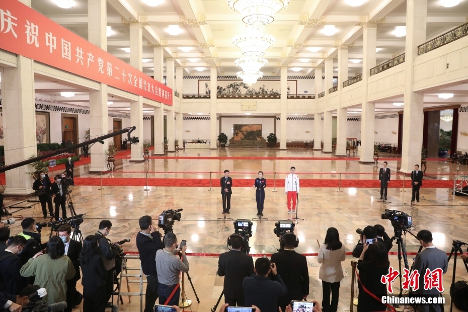 10月16日,中國共產黨第二十次全國代表大會在北京人民大會堂開幕。大會開幕前,舉行“黨代表通道”采訪活動。圖為中新社記者向代表提問。 中新社記者 蔣啟明 攝