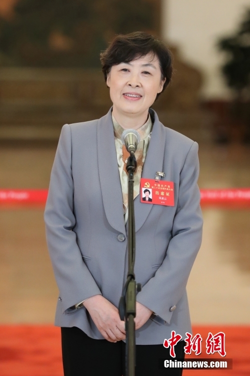 10月16日,中國共產(chǎn)黨第二十次全國代表大會在北京人民大會堂開幕。大會開幕前,舉行“黨代表通道”采訪活動。圖為姜麗娟代表接受采訪。 中新社記者 蔣啟明 攝