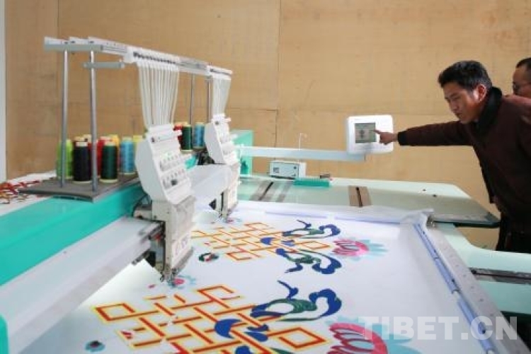 洛隆縣博織利民服飾有限公司老總向巴操作電子刺繡機刺繡帳篷上的圖案。陳衛國攝