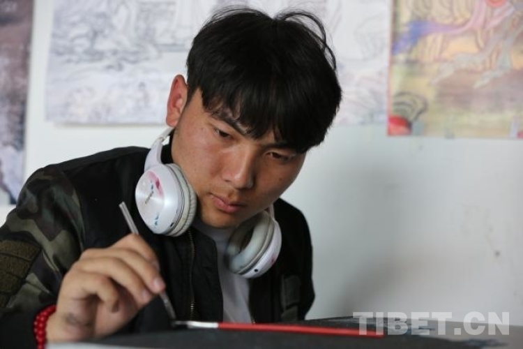 同期學員中,同樣來自唐卡世家的白瑪旺青,肩負家族厚望,被父親委派而來。2019年,白瑪旺青的父親學到半途,家中突然接到《格薩爾王與三十大將》的唐卡長卷訂單,不得不退學回到江達縣家中主持繪制工程。這次,他把兒子白瑪旺青、學徒桑培和尼瑪布派來學習,自己帶著46個學徒繼續完成訂制唐卡的繪制。“父親對唐卡漆畫很支持,要求我們認真學,學成后再傳授給他本人和更多的學徒,”白瑪旺青說,“我和父親覺得,創作漆畫比傳統唐卡快,也會贏得新的市場,能帶動更多學徒增收。”