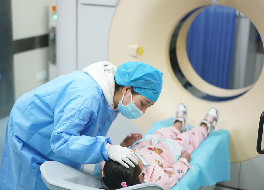 5月12日,南京醫科大學第二附屬醫院的護士在安慰準備接受CT增強檢查的小患者。新華每日電訊記者季春鵬攝