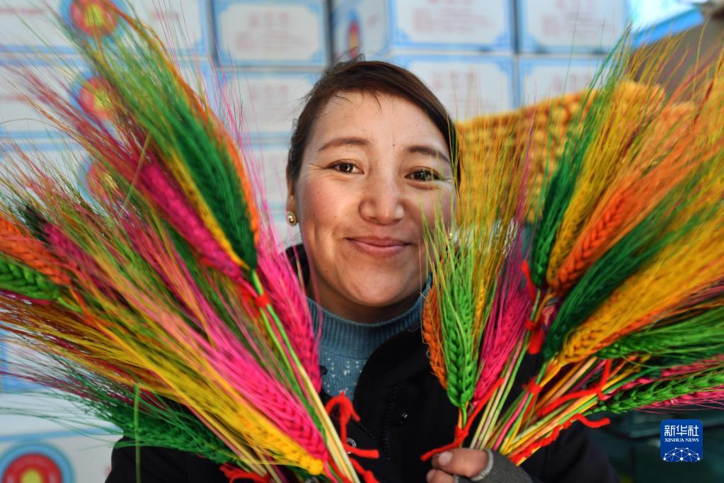 藏族姑娘索曲在展示出售的象征豐收的五彩麥穗(2月12日攝)。新華社記者 覺果 攝