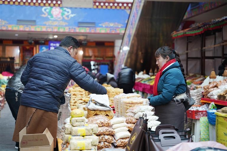手持羅薩梅朵的小孩在大街小巷里歡笑;腳邊放置著大量年貨的顧客正和老板磋商著手中切瑪盒的價格;阿佳一手提著采購好的年貨,一手牽著孩子稚嫩的小手……在藏歷新年來臨之際,這座千年古城被喜氣洋洋的人群交織出了濃濃的煙火氣息。(圖/記者 阿旺尼瑪)