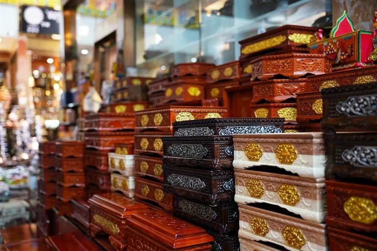 巴桑站在店門口展示著自家的切瑪盒,“我們家的切瑪盒做的可是一絕,而且不會因為快過年了就胡亂加價,50元至500元的都有,很多顧客都是從其他地方趕過來買。你看上面插的酥油花,這也是我父親做的,別看不大,每個都要兩三個小時才能做好。”巴桑說。