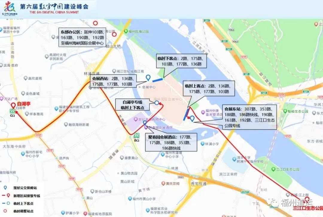 (2)可乘坐三江口生態公園——公交海峽國際會展中心東站區間專線,從三江口生態公園出發沿著南江濱東大道、浦下洲路、會展東路至公交海峽國際會展中心東站。