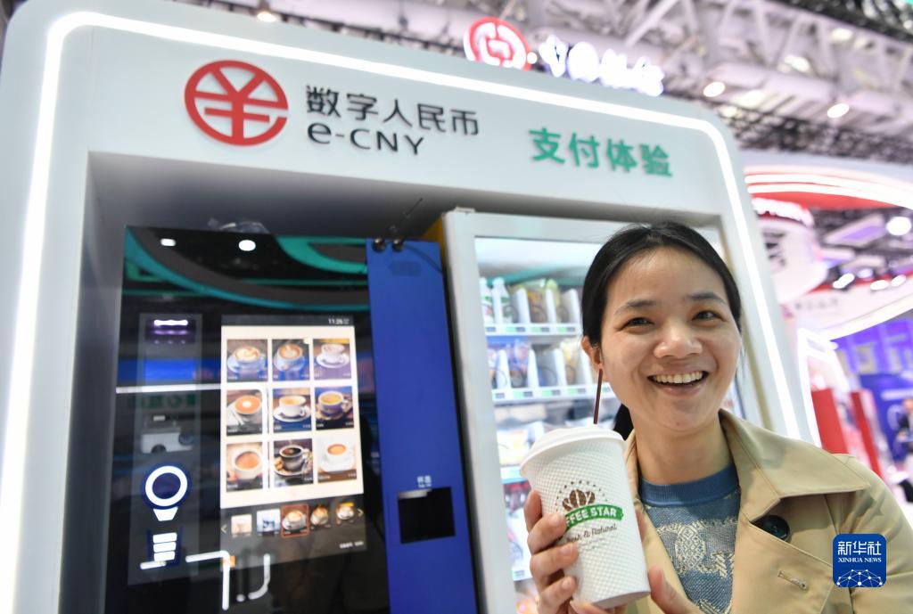 4月26日,在第六屆數(shù)字中國(guó)建設(shè)成果展覽會(huì)現(xiàn)場(chǎng),一名觀眾展示用數(shù)字人民幣購(gòu)買的咖啡。新華社記者 魏培全 攝