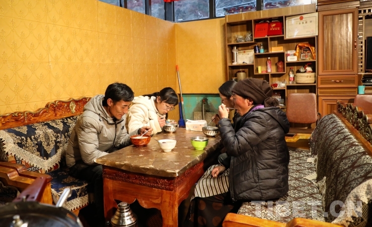 “古突”煮好了,扎西一家人圍坐在桌邊。“妹妹肯定會吃到辣椒,姐姐可能會吃到石頭。”阿媽尼瑪拉宗在吃“古突”前和姐妹兩人開玩笑,一家人相互打趣,有說有笑,其樂融融。