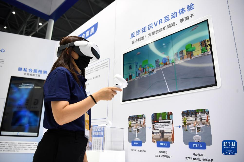 一家參展企業代表在2022年國家網絡安全宣傳周網絡安全博覽會上演示反詐知識VR互動體驗項目(2022年9月4日攝)。新華社記者 劉軍喜 攝