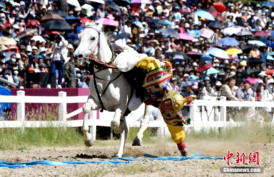 8月17日,騎手們進行馬術表演。當日,2023年拉薩雪頓節民族傳統馬術表演在西藏拉薩市北郊賽馬場舉行。
