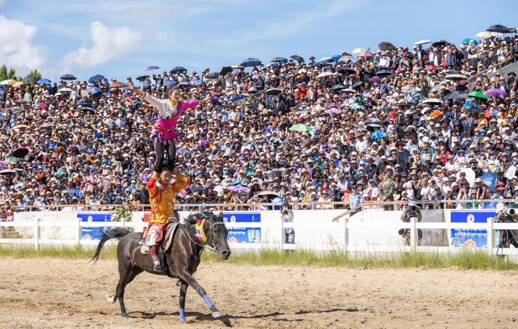 8月17日,2023拉薩雪頓節賽馬大會現場,兩位騎手正在進行單馬雙人表演。新華社記者 丁增尼達 攝