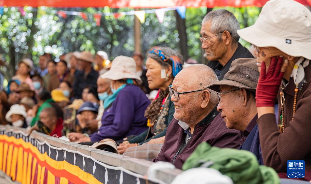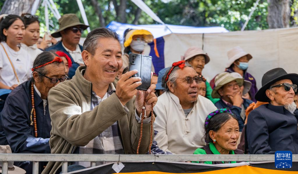 8月19日,在拉薩市羅布林卡園林內,觀眾在觀看藏戲表演。新華社發(丁增尼達攝)